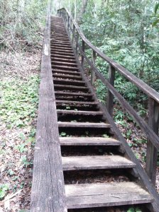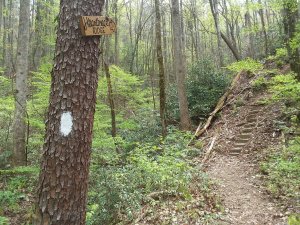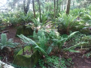 We left the beach at Arch Cape to begin the climb to Cape Falcon. We originally missed the sign for an important turn, so Julie hacked down the weeds obscuring the sign. There are rarely signs on this trail but in a few crucial places they exist. (In other crucial places, they don’t.)