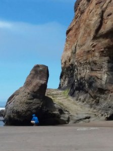 The most noteworthy is Hug Point, where the trail is on the last remnant of an old coastal road blasted into rock. This spot needs to be crossed within an hour of low tide. We made it, and took a deep breath. The alternative was to backtrack to a highway and get through that way. Ick.