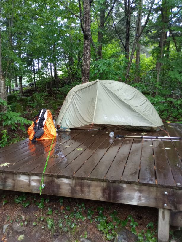 I ate breakfast at Young’s Store and bought a couple of goodies. I walked to Lake Francis where I had a reservation. Despite being on a platform, I managed to get my tent set up ten minutes before the rain burst through. It shook the platform I was on. Multiple campsites were underwater and I kept peeking outside to see if mine was next.