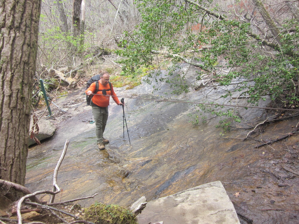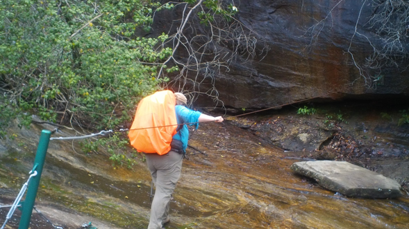 We caught glimpses of large rock faces and eventually came to a very interesting water crossing where a cable was strung up to help us. While the water was shallow, the rock was slick with water and algae, so it was a little more disconcerting that it looks. We stopped to filter water, and filter water, and filter water.