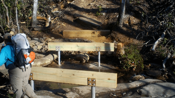 When we finally scraped our way to the river, there was a funky bridge to cross. I struggled here, because I was not tall enough to do what the rock was demanding of me. Eventually I hauled my pack up onto the rock where gistrailblazer was able to grab it, and then he helped me ascend. Had I slipped off the rock, I would have gone into the fast-moving river or onto rocks. I believe this area received work in late 2022, and that it is not as dramatic as it was in early 2022.