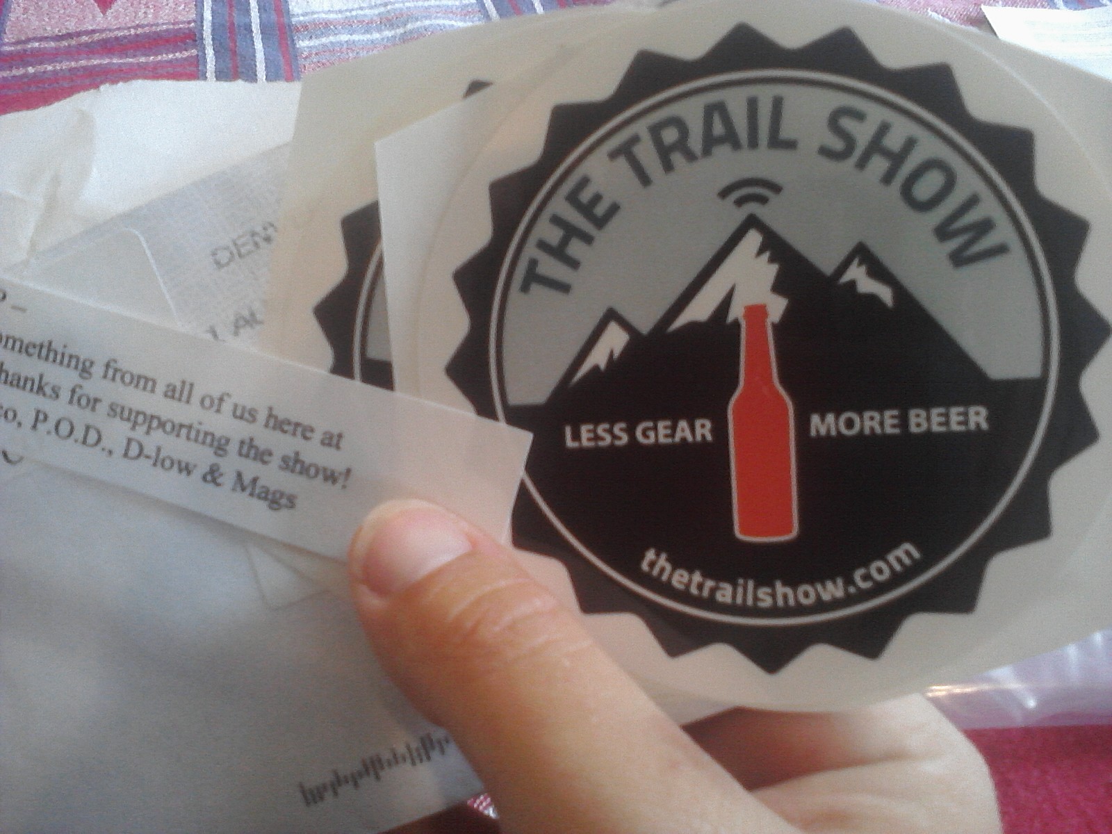 Woooo! I got The Trail Show stickers in the mail! On rough days, The Trail Show always gives me a couple extra miles. Thanks Disco, P.O.D., D-low & Mags!