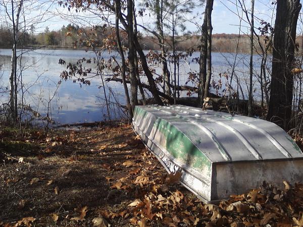 My campsite comes with a sketchy-looking boat. And a PICNIC TABLE. I am excited about one of these things.