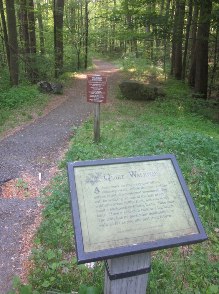 I followed the Gatlinburg Trail out of town to Sugarlands Visitor Center, which was nowhere near open yet. I then had to walk the road for about a mile before joining the Bullhead View Quiet Walkway which took me to Huskey Gap Trail (and showed me my 2nd bear of the day!). It was pretty great to be out so early – I had to dodge fewer than a dozen cars, so while the roadwalk was not a perfect solution, it was a necessary and safe enough link.
