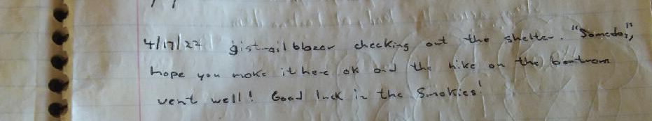 I spent the night camping near the Fontana Hilton, a swanky shelter with a shower (!), toilets, and a charging station. In the hiker log book, I found a note left for me by gistrailblazer as he was en route home from our Foothills Trail hike!