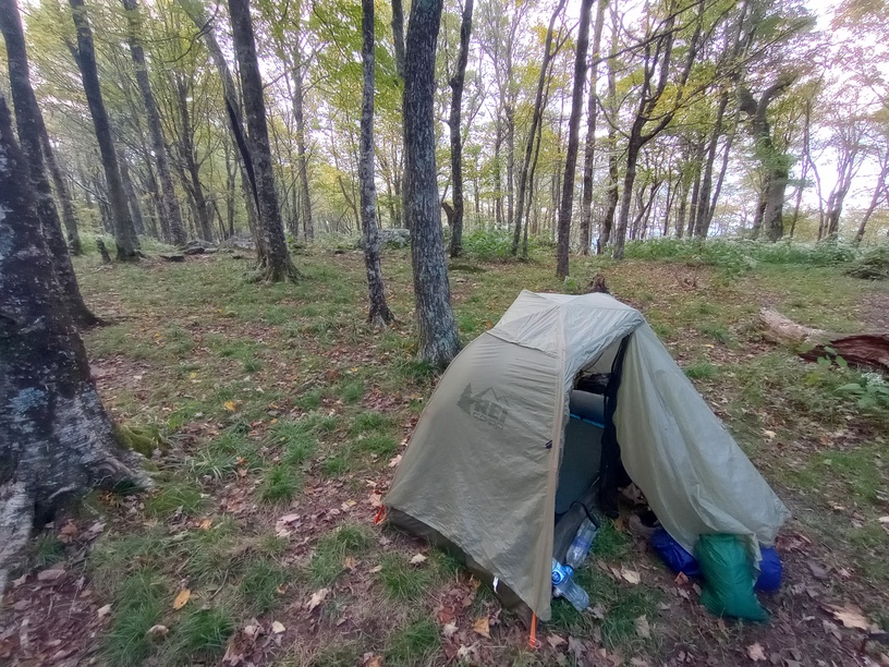 After hours of hiking mostly uphill, we arrived at our campsite, Flint Gap, and continued 0.1 miles to find a trickle of water. We were so grateful and relieved. I set up a leaf to help channel water into my bottle and I drank deeply for the first time all day. Gistrailblazer, on the other hand, accidentally launched his bottle into a ravine and had a great time bushwhacking to get it. We filled everything we could, and headed back to the campsite. It’s a small, odd little site, and I was so happy to be there – and be there without others. This tiny site really shouldn’t ever be expected to host more than 3 or 4 tents.