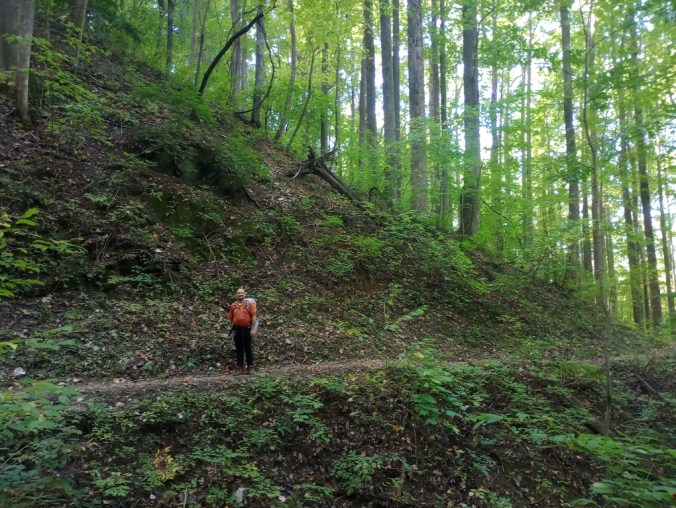 We descended to a famous spring where once there was a shelter, and got to hike miles of the old Appalachian Trail route to Doe Knob. I now know why the AT has a 90 degree turn at this location. It used to go straight, tracking over the miles we’d just walked.